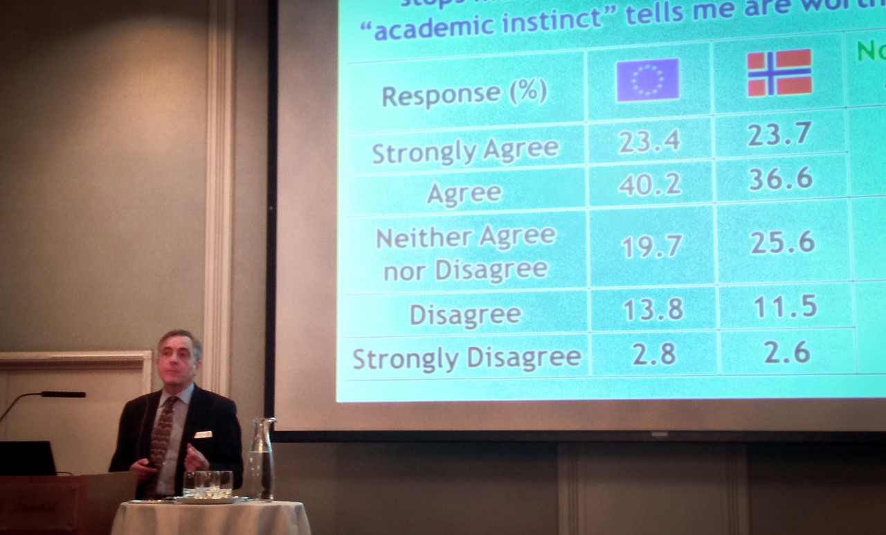 – Flertallet av de norske deltakerne, det vil si 60 prosent, svarer at de ikke kjenner til noen særskilt lov som sikrer den akademiske friheten, påpekte Karran da han la fram funn fra undersøkelsen på seminaret.