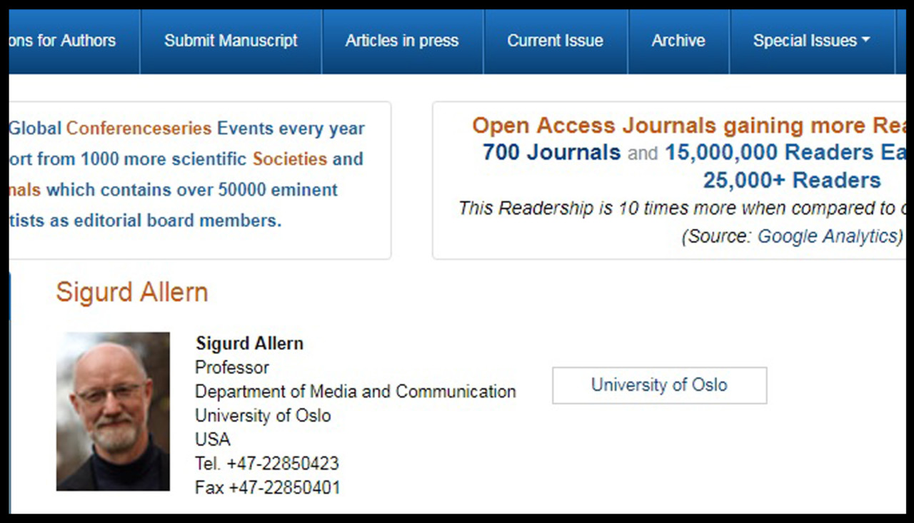 Professor emeritus i medievitenskap Sigurd Allern står for eksempel står oppført med bilde og full biografi i OMICS-tidsskriftet Journal of Mass Communication & Journalism.