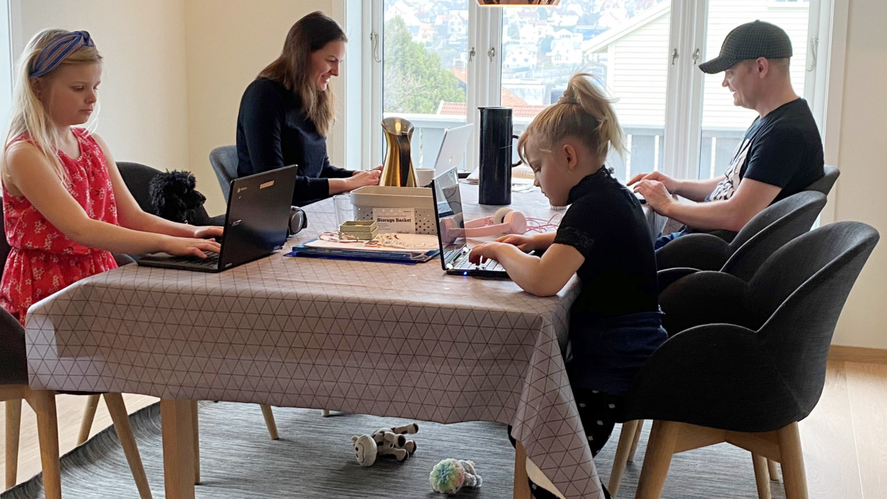 Nå sitter hele familien – Ingrid og Rune og jentene deres Sonja (7) og Norma (10) – samlet rundt stuebordet og jobber.
